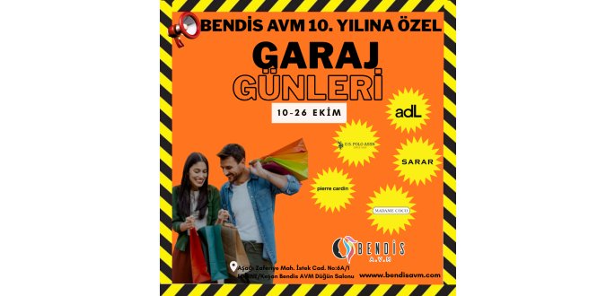 Yok artık dedirten fiyatlarla Açılışımızın 10.yılına Özel Garaj Günleri Bendis AVM’de başlıyor. 10 Ekim - 26 Ekim tarihleri arasında Uspa Polo, Pierre Cardin, Madame Coco, Sarar, Adil Işık gibi dünyaca ünlü markalarımızla, tekstilden ayakkabıya, ev dekorasyonundan aksesuara kadar her şey inanılmaz indirimlerle garaj günlerinde sizleri bekliyor.
