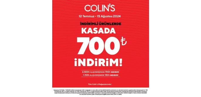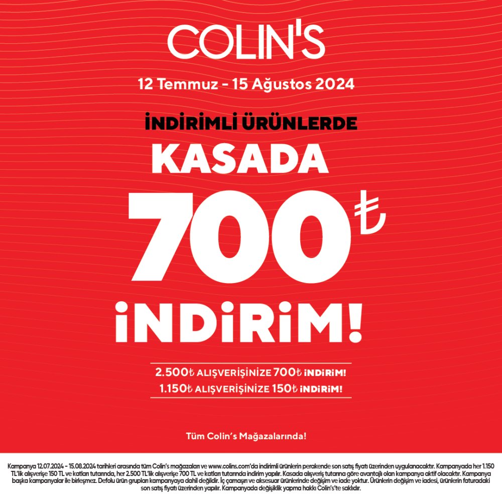 Colins'de indirimli ürünlerde kasada 700 TL indirim!!! İndirimden yararlanmak için hemen Bendis AVM Colinse bekleniyorsunuz